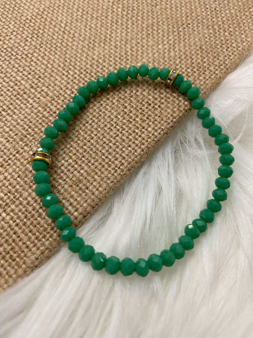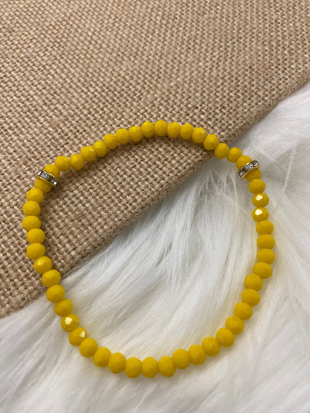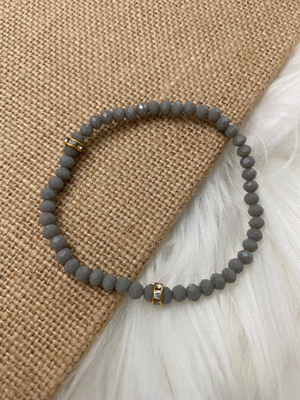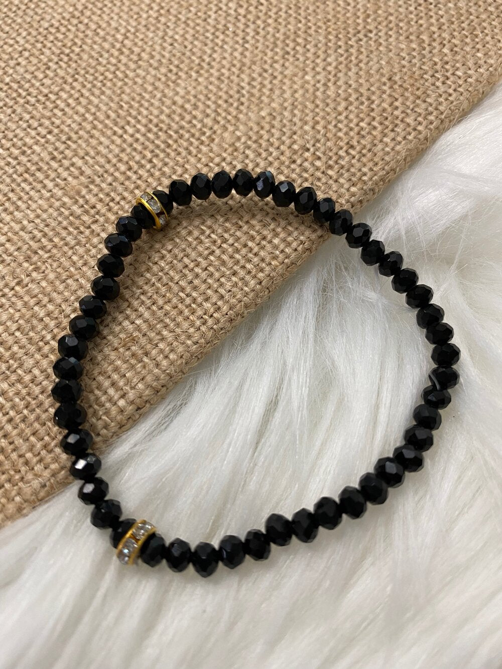 Solid color mini faceted beads make up these adorable mini stretch bracelets that are perfect to add to your bracelet stacks, giving an added dimension. Spacers with rhinestones add a little extra sparkle.