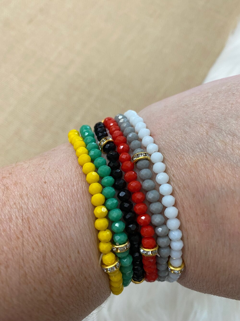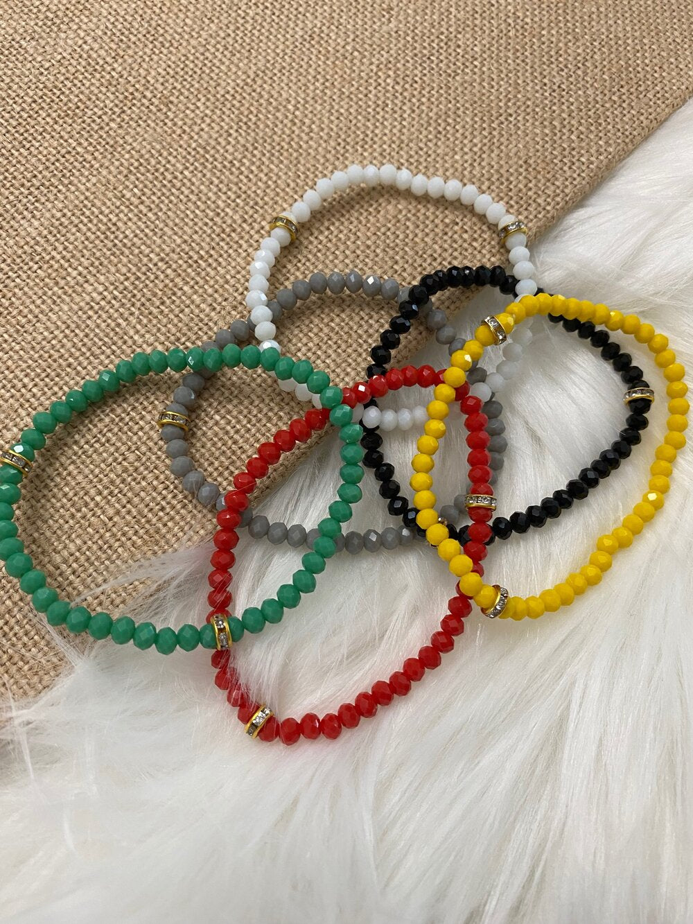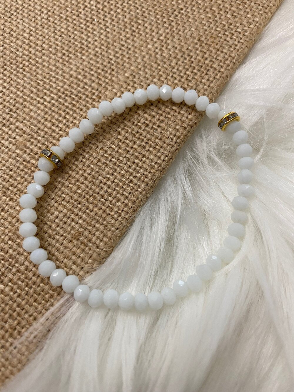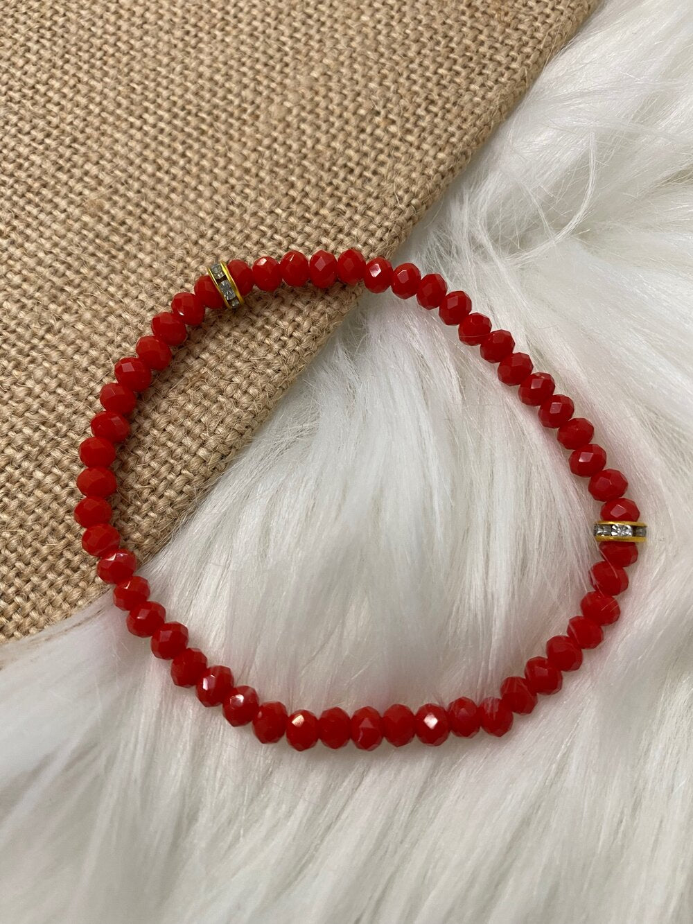 Solid color mini faceted beads make up these adorable mini stretch bracelets that are perfect to add to your bracelet stacks, giving an added dimension. Spacers with rhinestones add a little extra sparkle.