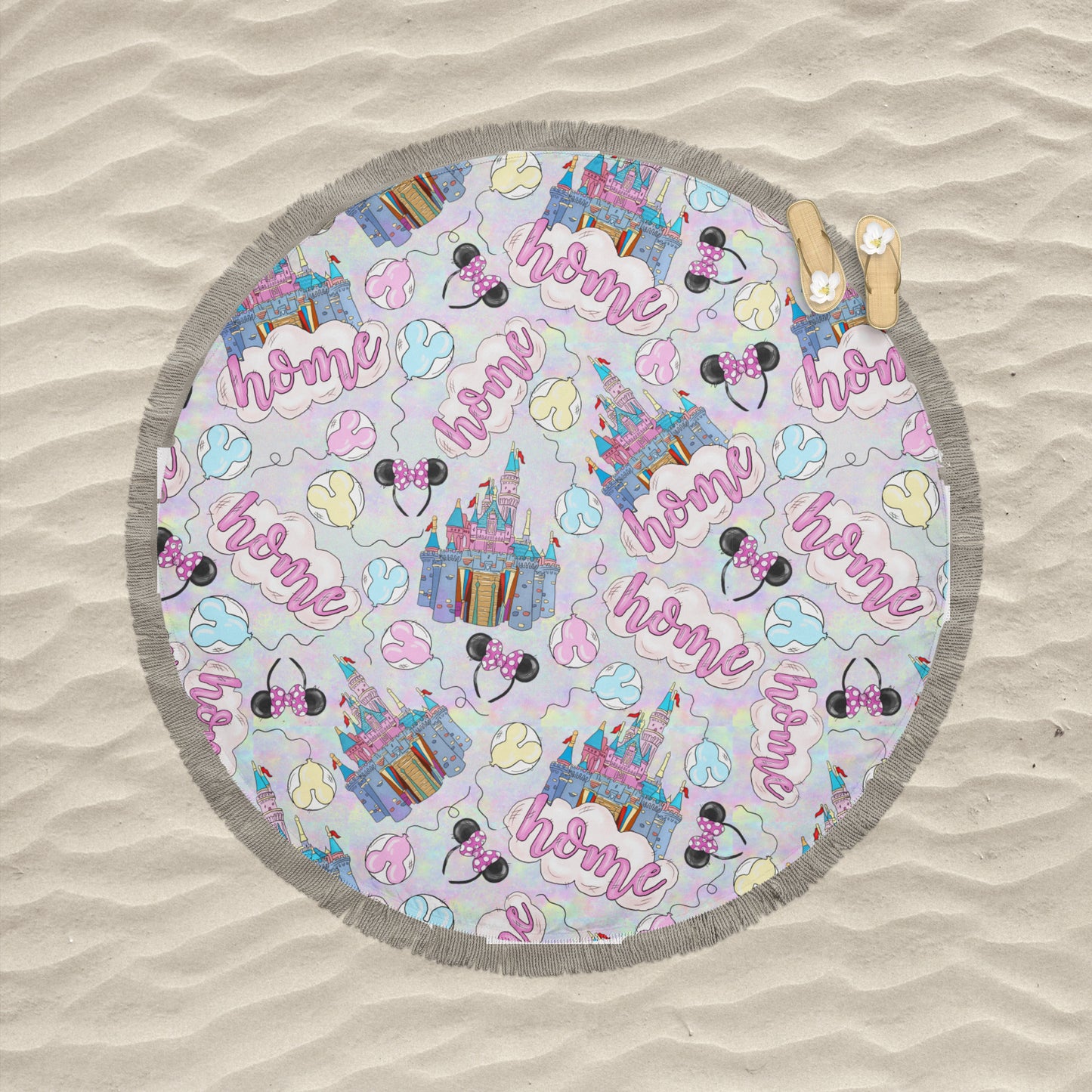 Large microfiber beach towel with white fringe. Roughly 5' in diameter.