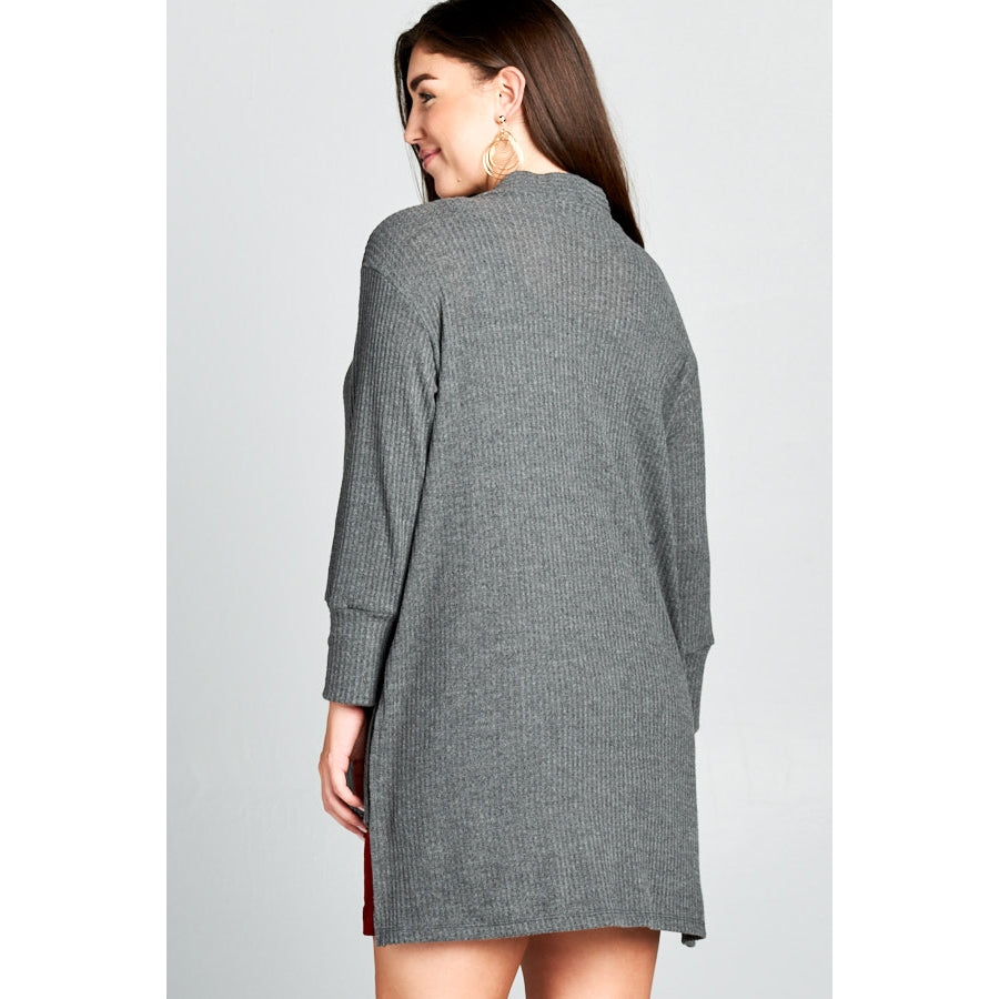 Plus Cozy and Casual Open Front Waffle Brush Knit Pocket Cardigan with High Low Side Slit Cut Detail