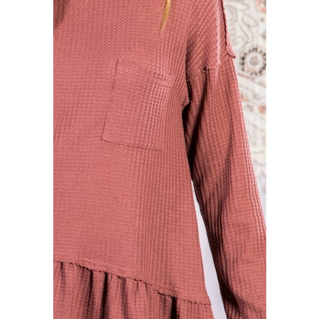 Solid soft waffle knit tunic top - Pocket patched - Ruffle hem - Dropped shoulder - Raw seamed