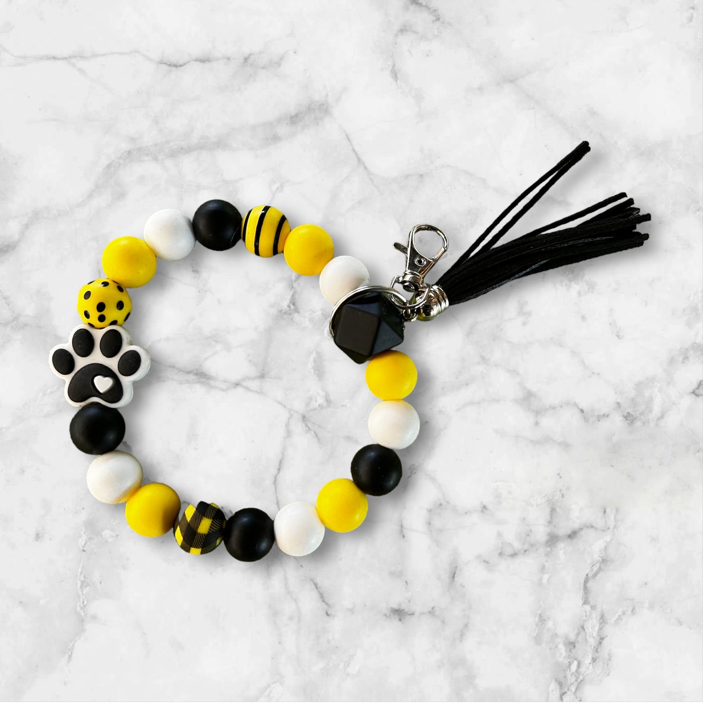 This is a non stretch wristlet that features 15mm silicone beads, keychain with clip, and tassel.